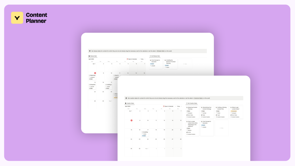 Content production isn't just about the release date. It's also necessary to schedule time for content creation. Use this template for planning: select platforms, quickly add ideas, set content creation dates, and plan releases in the calendar ✨