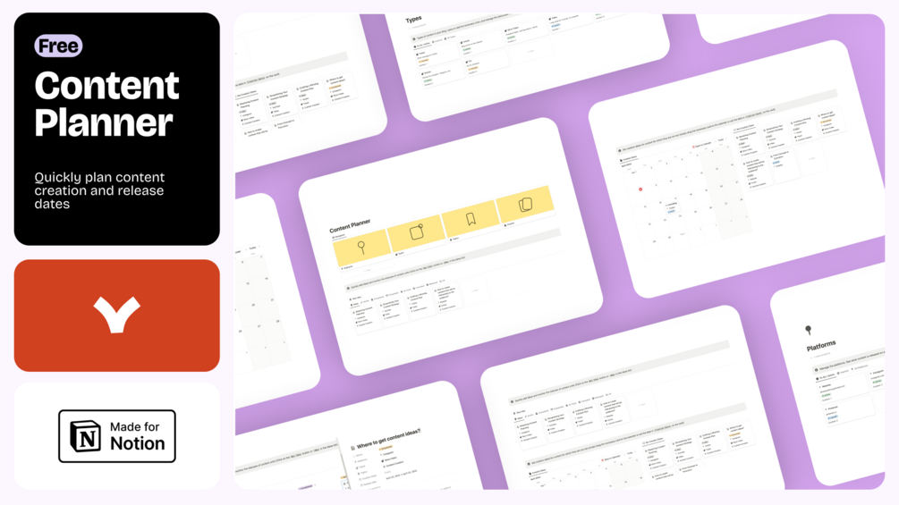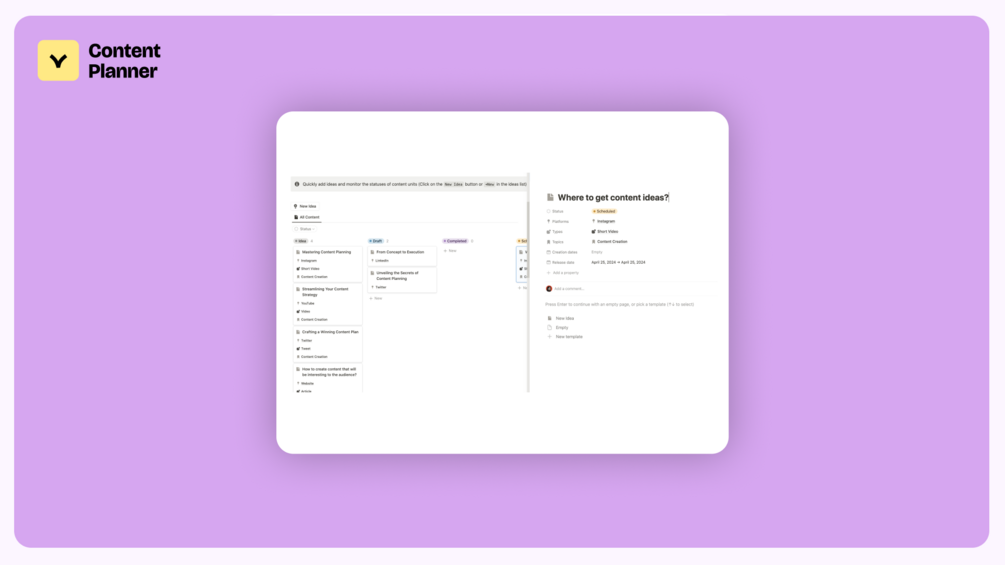 Content production isn't just about the release date. It's also necessary to schedule time for content creation. Use this template for planning: select platforms, quickly add ideas, set content creation dates, and plan releases in the calendar ✨